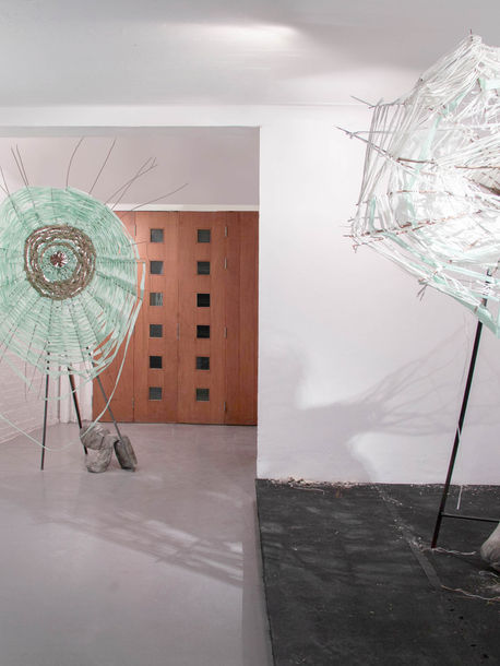 Concrete, steel, jubilee clips, synthetic fibres, three suckers, leaves, petroleum jelly.